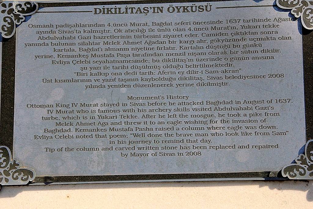"Osmanlı Padişah-larından 4. Murat Bağdat seferi öncesinde 1537 tari-hinde Sivas'ta kalmıştır. Ok atıcılığı ile ünlü olan 4. Murat'ın Yukarı Tekkede Ab-dulvahabi Gazi Hazretlerinin türbesini ziyaret eder. Cami den çıktıktan sonra yanında bulunan silahtarı Melek Ahmet Ağa'dan bir kargı alır ve gökteki kartala Bağdat'ı alma niyeti adına fırlatır. Attığı kargının öldürdüğü kartalın düştüğü yere de nişahgah olarak bir taş dikilir."