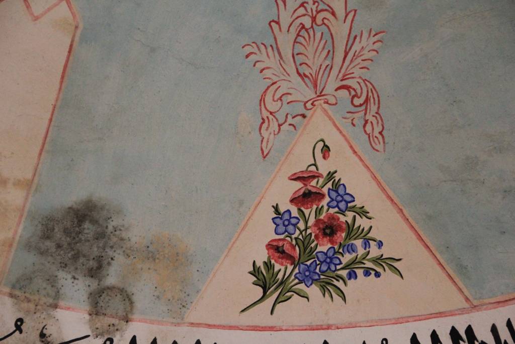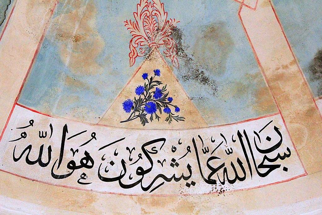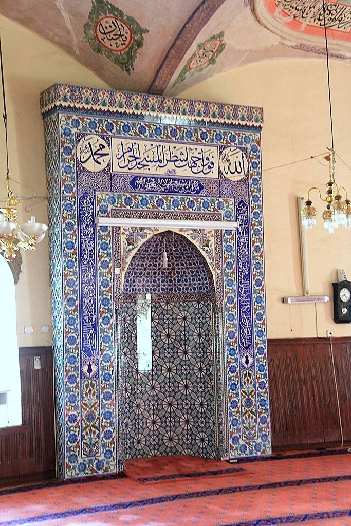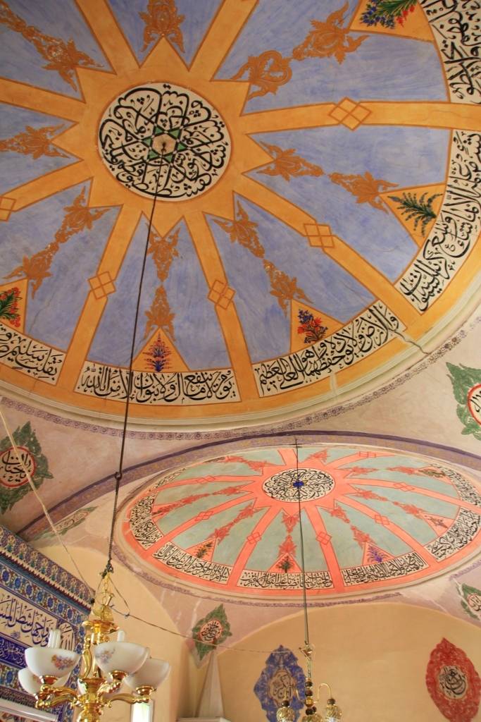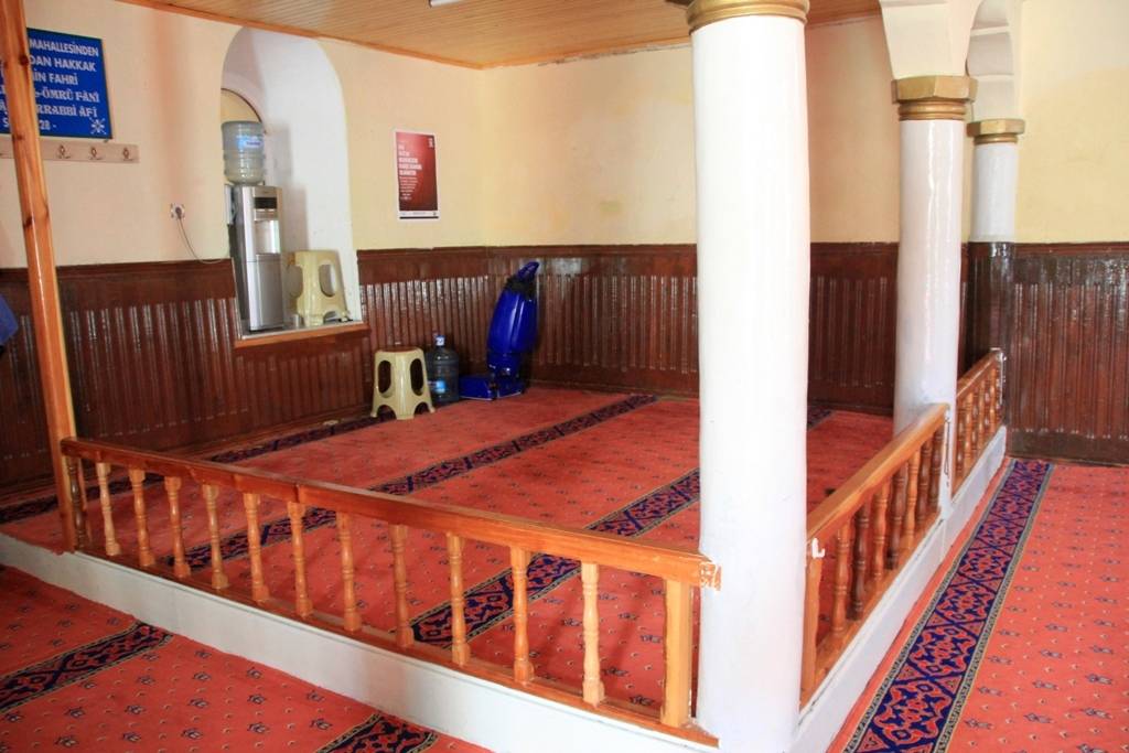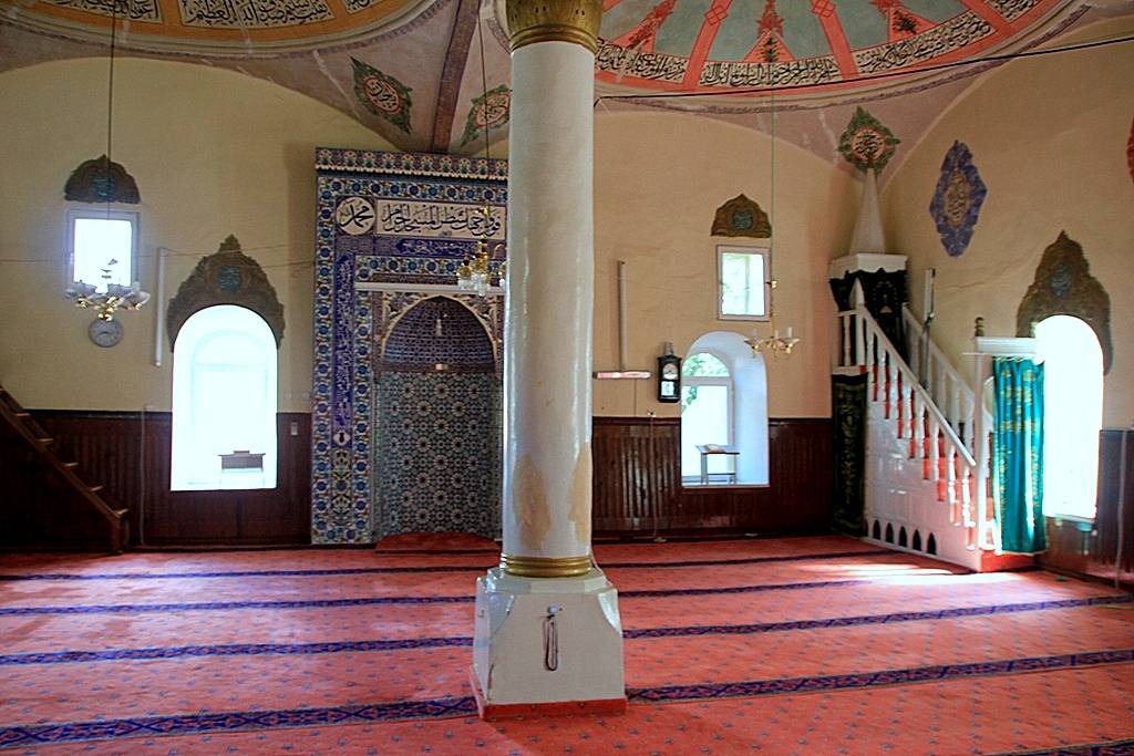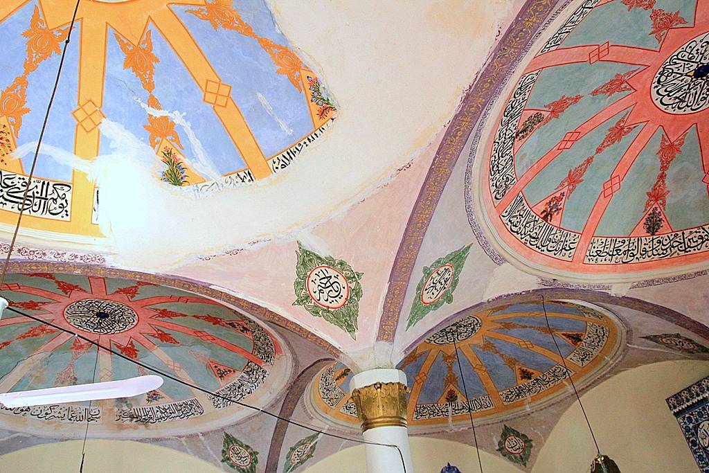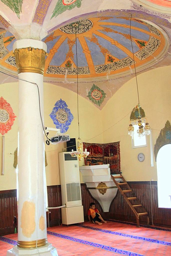 Cami kırma çatısı kiremit kaplı, alt tavan döşemeleri ahşap malzemeden yapılmıştır. Caminin harim kısmının tavanları yarım kubbeler ve içleri kalem işi süslemeleri ile dikkat çekmektedir. Süslemelerde çiçek motifleri çok değişik şekillerde uygulanmış. Merkez sütuna bağlı kubbeler ve iç süslemeleri değişik renklerle boyanmıştır.