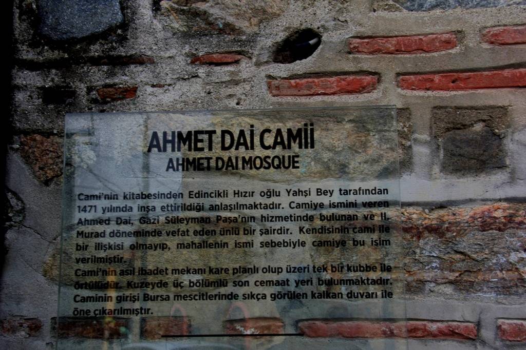 Mahalle camii tipindedir. Camiye adını veren Ahmed Dai'nin cami ile bir ilişkisi bulunmayıp, sadece Ahmed Dai Mahallesi'nde bulunması nedeniyle bu ad verilmiştir. Ahmed Dai, Gazi Süleyman Paşa'nın hizmetinde bulunan ve I.Murad döneminde yaşamını yitiren ünlü bir şairdir.