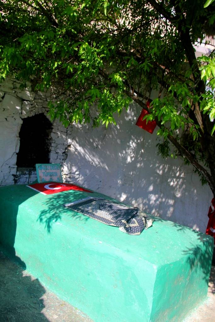 Sakız Dede namı ile ilçemizde türbesi bulunan kişinin kim olduğu ve kimin için yapıldığı hakkında bir bilgi ne yazık ki bulunmamaktadır. Çeşitli kaynaklarda tarihimizde Fetret Devri diye bilinen ve Çelebi Mehmet tarafından sona erdirilen dönemde devlete isyan eden Simavna kadısı Şeyh Bedrettin’in müritlerinden Börklüce Mustafa olduğunu ileri süren çeşitli kaynaklar vardır. İsyanı kanlı bir şekilde sona erdirilen Şeyh Bedrettin, Börklüce Mustafa ve Torlak Kemal ile birlikte binlerce müridi idam edilmişlerdir. Sakız Dede’nin Börklüce Mustafa olduğu iddiası Tire’nin Gökçen köyünde idam edilmesi ve naaşının sonradan gizlice kaçırılarak Kuşadası’na gömülmesidir. İddiaya göre Sakız Dede türbesi etrafında Bektaşi Cevraki mezarlığının varlığı, türbe yakınlarında bir Alevi-Bektaşi cem evinin bulunması, iki oluklu mahallesinde yüzyıllardır aşure geleneğinin devam etmesi ve türbenin mumyalık kısmının olmaması, vb. tezler ileri sürülmektedir.