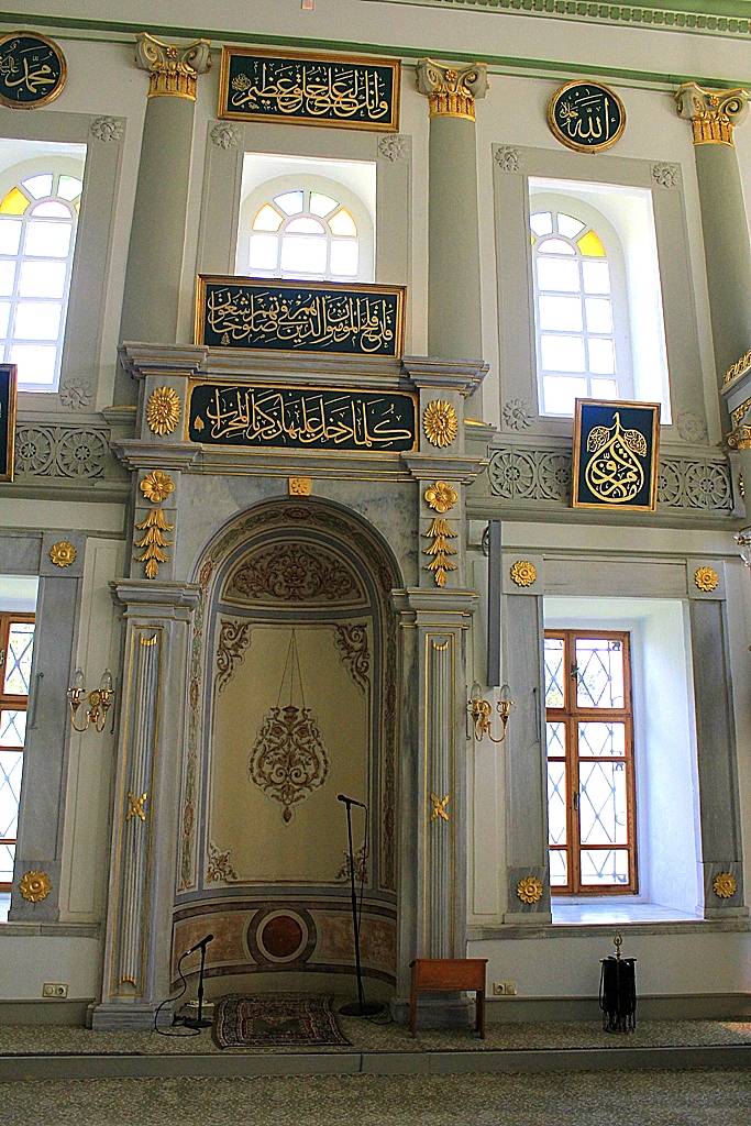 Dıştan, herhangi bir çıkması olmayan mihrap, içerde kalem işlemeleriyle zenginleştirilmiştir. Caminin düz ahşap tavanının ortasında, altın yaldızla yapılmış ampir üslubunun karakteristik öğeleriyle oluşturulmuş bir göbek bulunmaktadır.