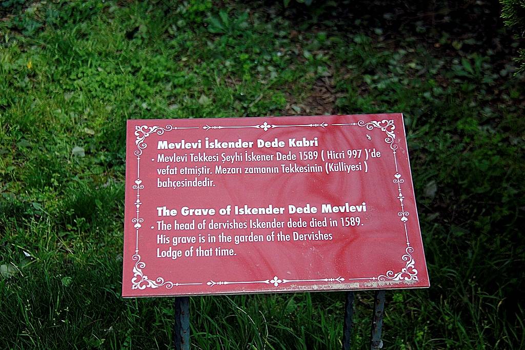 Miladi 1589 (Hicri 997) yılında vefat eden İskender Dede'nin, vaktiyle ulu çınarlar ve selvi ağaçlarıyla bezeli bu bahçede; bir de kendi adıyla anılan zaviyesi bulunmaktaydı. Ancak zamanla, kabrin yanındaki zaviye'den herhangi bir iz kalmamıştır.