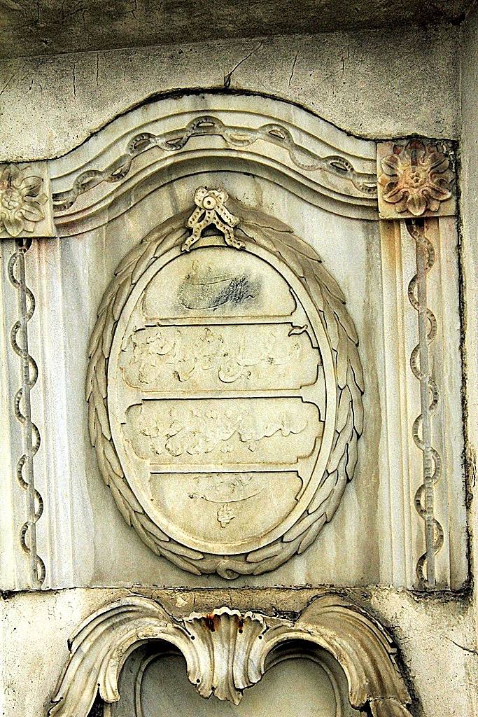 beyti mermer yapraklardan çerçevesi olan beyzi bir levha içinde idi. Gûya tepesindeki mermer fiyonga ile duvara asılmıştı.