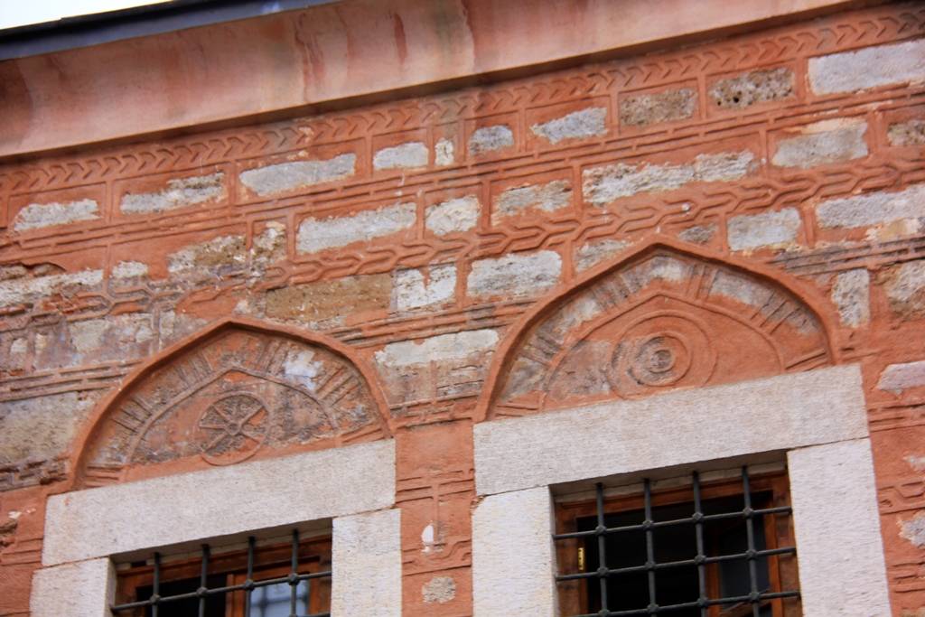 Caminin beden duvarlarından biraz dışa taşkın olan üst katta ise kütüphaneye açılan iki adet dikdörtgen formlu pencere açıklığı yer almaktadır. Ahşap doğramalı pencereler lokmalı demir parmaklıklara sahiptir. Beyaz renkli düzgün kesme taştan lento ve sövelere sahip olan pencerelerin üzerinde hafifletme kemerleri mevcuttur. Çökertme olarak yapılan kemerler sivri kemer formundadır. Kemerlerin içerisine ise daire şeklinde süsleme öğeleri yerleştirilmiştir. Bitişiğindeki caminin beden duvarlarından biraz daha alçak olan kütüphanenin beden duvarları oldukça kaba bir içbükey silmeyle sonlanmaktadır. Taş ve tuğla kullanılarak oluşturulan almaşık duvar tekniğinde, derzler üzerinde çeşitli geometrik düzenlemelerle yapılmış süslemeler görülmektedir.