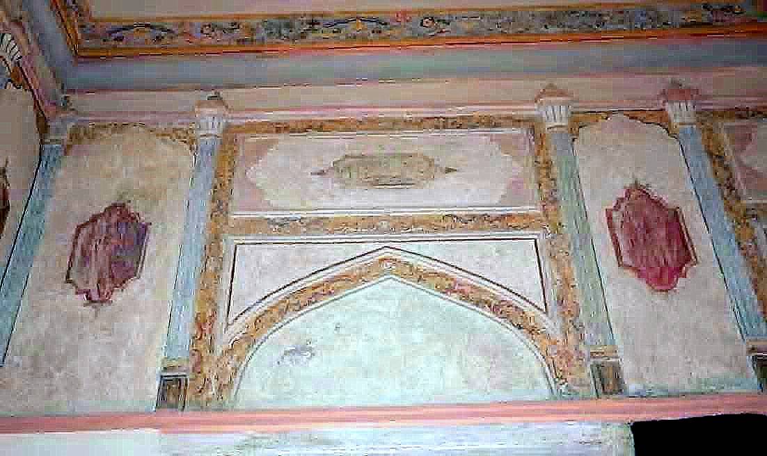 Pencerelerin üst hizasından, tonoz eteğine kadar olan bölüm mermer taklidi sütuncelerle küçük birimlere ayrılmıştır. Pencere hizasına gelen sütunceler sivri kemerlerle birbirine bağlanmıştır. Ayrıca bu kemerlerin üzeri de yine kalemişleriyle oluşturulmuş kartuşlara sahiptir. Kütüphanenin üzeri aynalı tonozla örtülüdür. Aynalı tonozun göbeğinde “C” kıvrımlarıyla sonlanan dikdörtgen şeklinde kalemişi bir kartuş yer almaktadır. Tonozun karın kısmında da barok karakterli küçük şemseler bulunmaktadır.