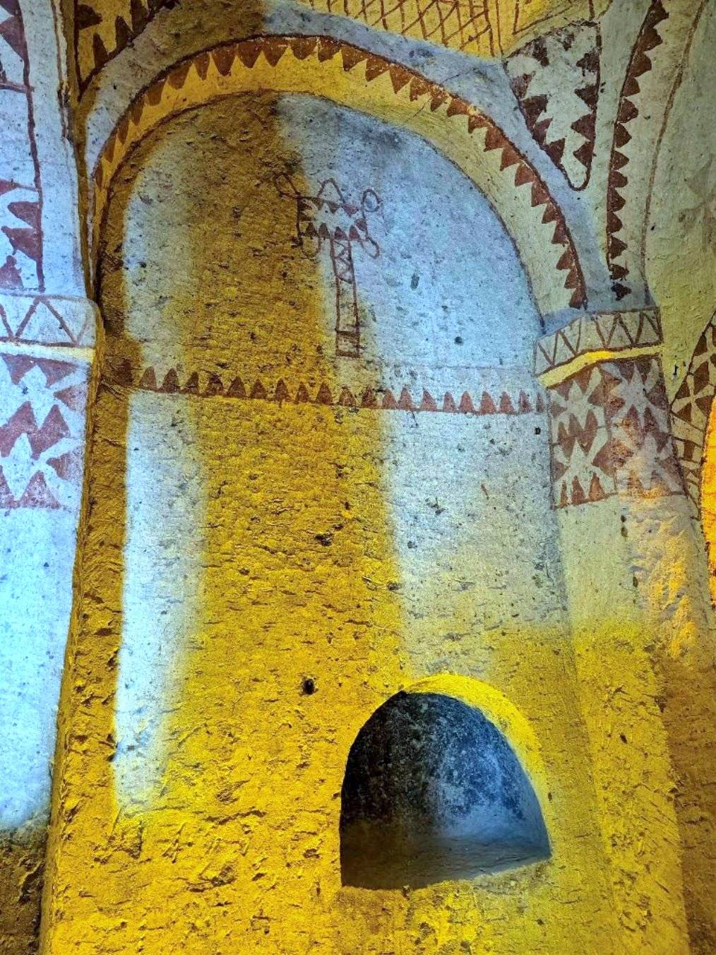 Haç planlı ve iki sütunlu şapelin batı, kuzey ve güney haç kolları beşik tonozludur. Şapelin merkezi ile doğu haç kolu ve doğudaki iki köşe mekânı kubbelidir. Bir ana ve iki yan apsisi bulunmaktadır. Kilise duvarlarında resmedilen motifler, kırmızı boya ile doğrudan kaya üzerine çizilmiştir. Duvarlarda ve kubbede zengin geometrik motifler, mitolojik hayvanlar ve askerî semboller bulunmaktadır. Ayrıca duvarlarda taş izlenimi veren motifler de yer almaktadır. Ana apsiste Pantokrator İsa Sahnesi, kuzey haç kolunda at üzerinde ejderle savaşan Aziz George ve Aziz Theodore tasvirleri, batı haç kolunda ise Azize Barbara tasviri bulunmaktadır.