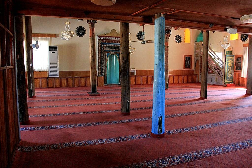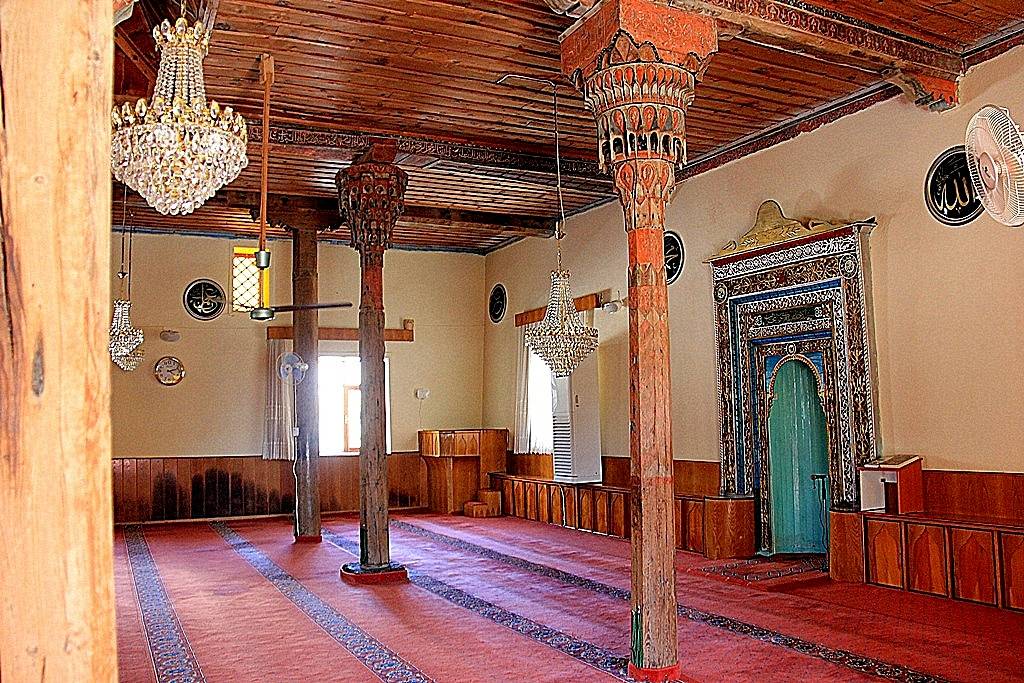 İç Görünüşü: Cami duvarları içerden çimento harç ve kireç badanalıdır. Harim, yuvarlak ve çokgen kesitli ahşap destek sıraları ile mihrap duvarına dik olarak uzanan beş sahına ayrılmıştır. Orta sahın yan sahınlardan daha geniş tutulmuştur. 3.95 metre genişliğinde olan orta sahının doğusunda kalan ara sahın 2.45 metre, ara sahınla doğu duvarının sınırladığı dış sahın 2.45 metre genişliğindedir