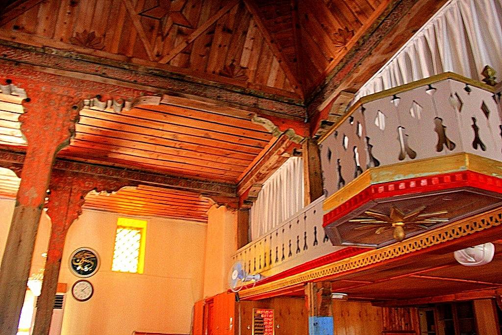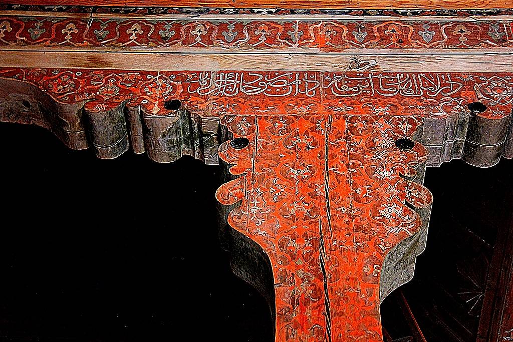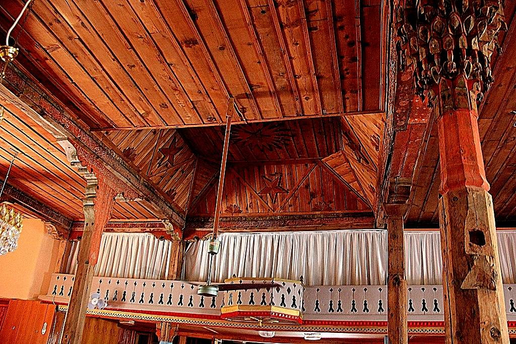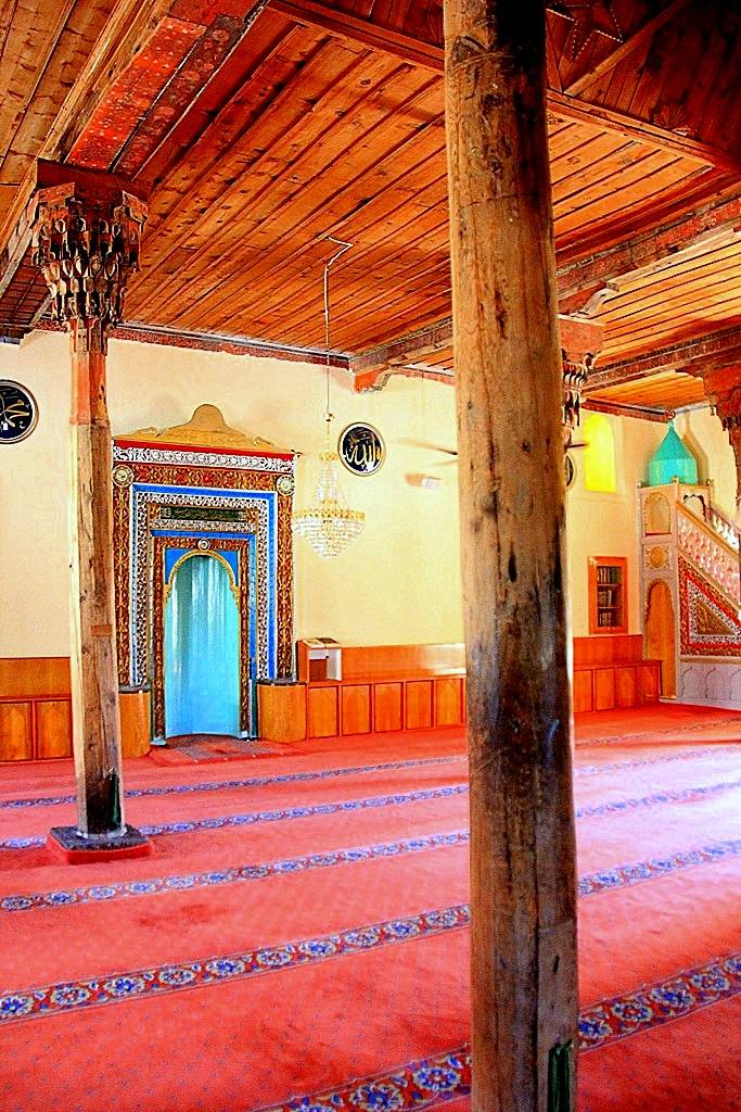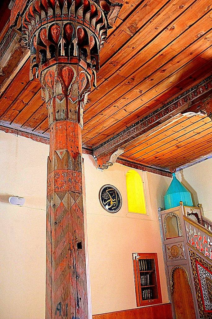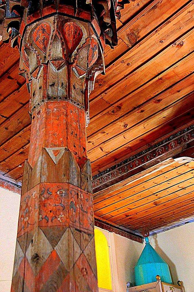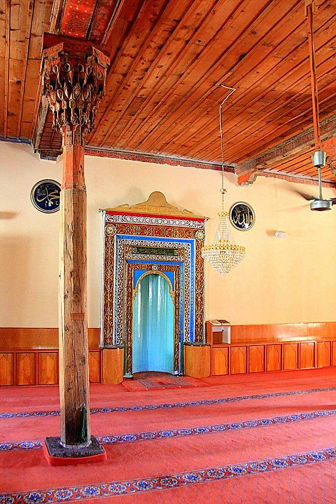 Tavan: Alttan tahta kaplamalı olan tavan, kıble duvarına dik istikamette, kalınlıkları 25-32 cm arasında değişen dört ana kirişe taşıtılmıştır. Bu kirişlerden; batıdaki ikisinin kuzey ucu ile doğudaki ikisinin güney ucu doğrudan duvarlara, diğer uçları duvarlardan çıkarılmış ahşap konsollarla, ortada yastıklar vasıtasıyla ahşap direklere otururlar. Bunlardan doğuda kalan ikinci ana kiriş, güney duvarından başlayarak kuzeye doğru üçüncü direk (Kadınlar Mahfili Korkuluğu) hizasına kadar 25’er cm genişliğinde yan yana iki kirişten müteşekkildir. Ayrıca bu çift kirişin kuzey uçlarından başlamak üzere minare gövdesine kadar uzanan enine bir kiriş atılmıştır. Bu ana kirişlerin yan yüzleri ve altları tahta levhalarla kaplanmıştır. Kaplamaların bir kısmı boyalı nakışlarla süslenmiştir. Destek Sistemi: Ahşap tavan örtüsü, doğudan batıya doğru, her sırada 4, 5, 4, 4 olmak üzere toplam 17 ağaç destek tarafından taşınmaktadır. Üstten yastıklar vasıtasıyla taşıyıcı ana kirişe bağlanan bu destekler, daire ve sekizgen kesitli olup, çapları 18-30 cm arasında değişmektedir. İçlerinde en süslü ve değişik olanları, mihrap duvarı önündeki batıda kalan ilk üç destek ile bunlarla mahfil arasında kalan batıdaki ilk iki destektir. Mihrap önünde olanların gövdeleri sekizgen plânlıdır.