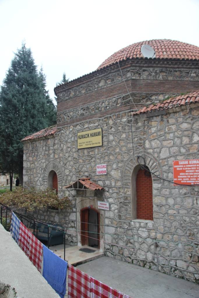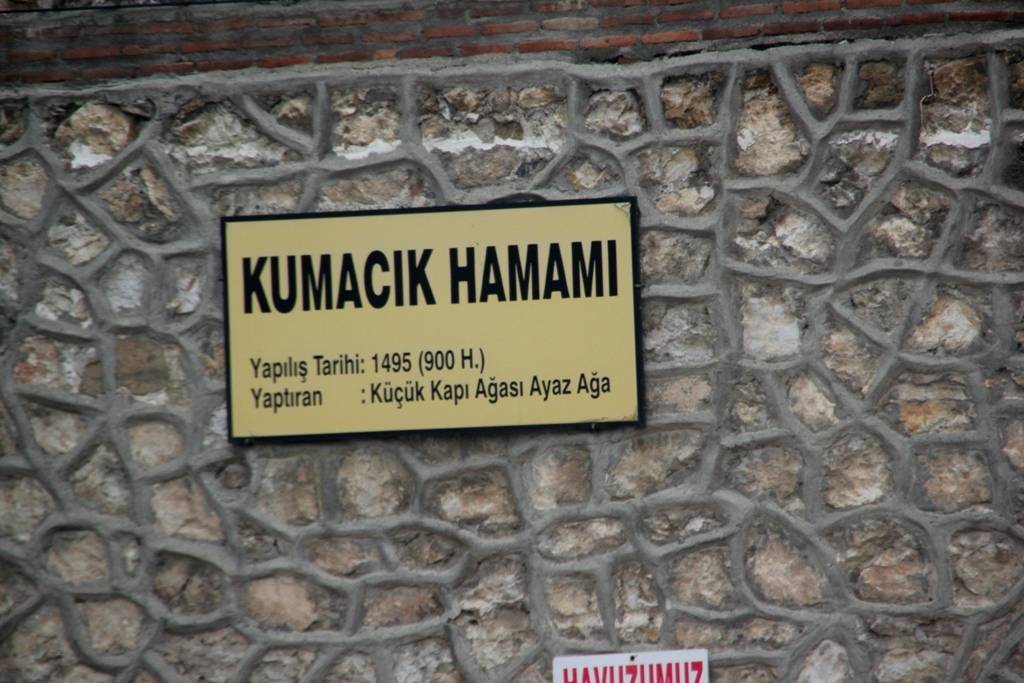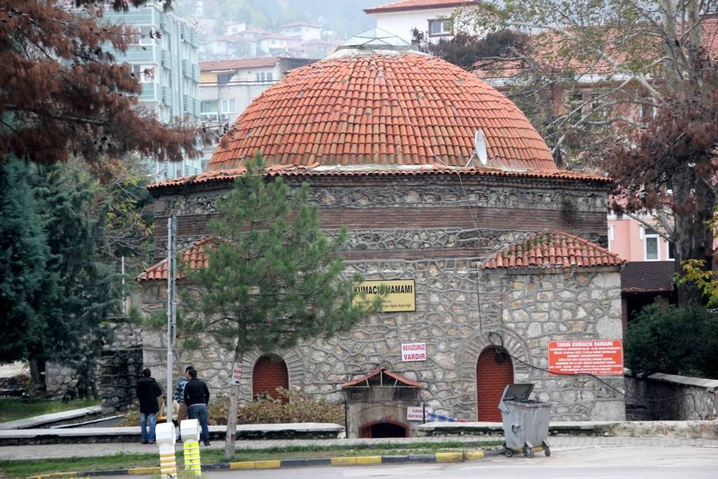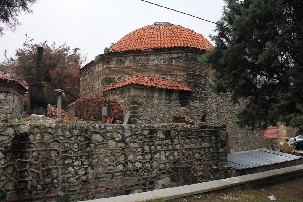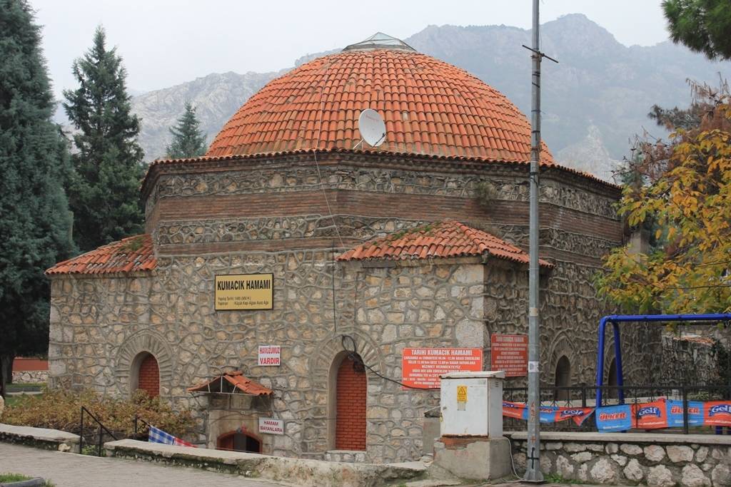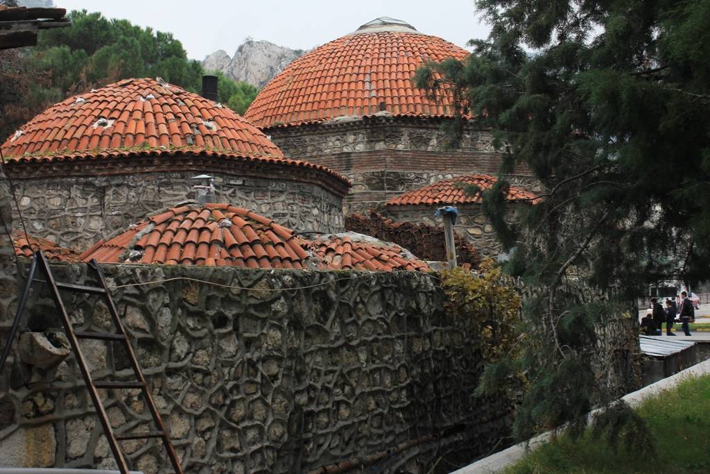 soyunmalığın üzeri üçgenlerle geçilen büyük bir kubbe ile örtülmüştür. Sıcaklık kısmı, bir ana kubbe, dört eyvan ve iki