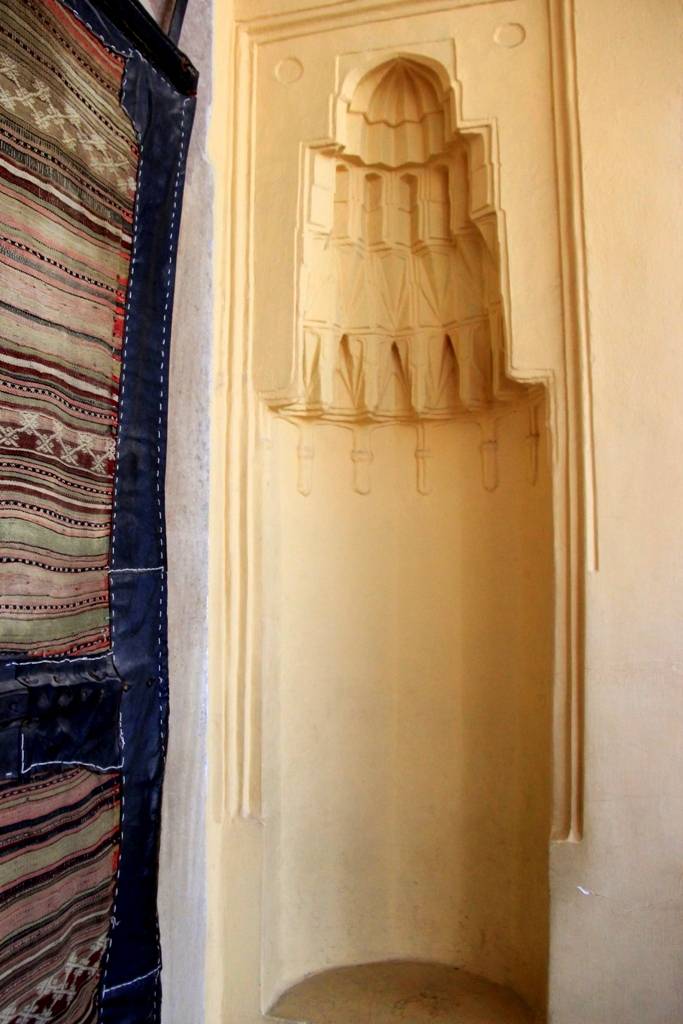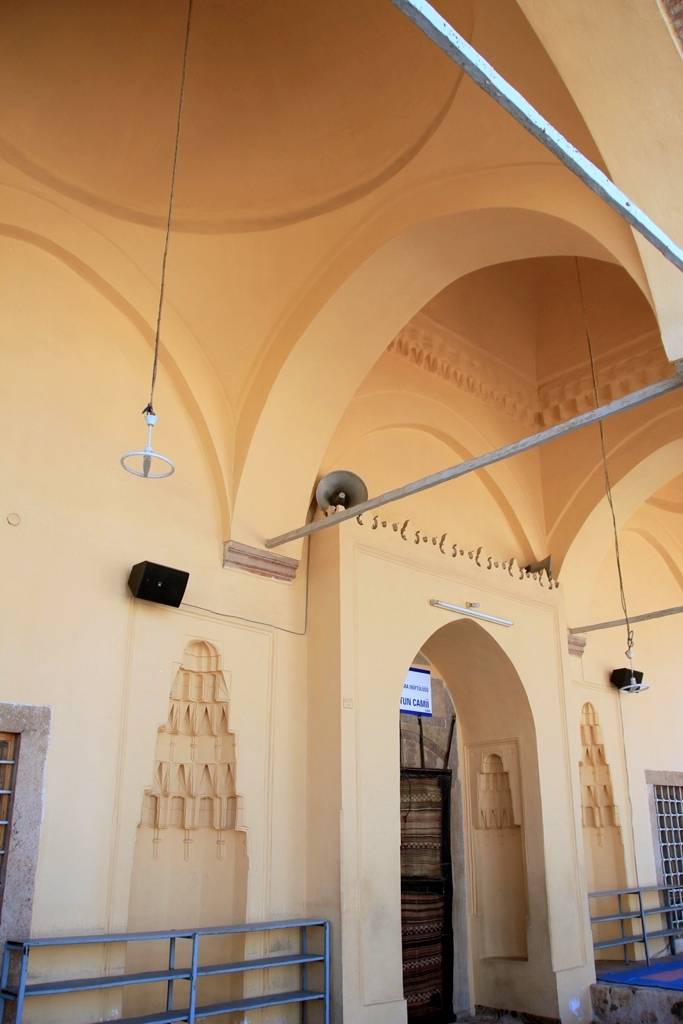 Klasik üslûbu yansıtan âbidevî mermer mihrabın beşgen kesitli nişi yanlarda sütunçeler, yukarıda beş sıra mukarnaslı kavsara ile kuşatılmıştır; köşelerinde birer rozet göze çarpar. İki renkli mermerden yapılan minber titiz bir işçiliğe ve değişik bir görünüşe sahiptir. Kadınlar mahfilinin alt kısmına rastlayan tavanda geometrik düzen içerisinde süslenmiş ahşap bir göbek dikkat çeker. Altın yaldızlı kalem işleriyle bezeli geometrik yıldız geçmelerin içleri kahverengi çiçek ve yapraklar, bordür ise nar çiçekleri ve hançer yapraklarının (saz) yer aldığı XVI. yüzyılın klasik motifleriyle dolgulanmış, göbeğin etrafında tavan kenarları beyaz üçgenlerle çevrili kırmızı altıgenler ve siyah konturlarla dekore edilmiştir.