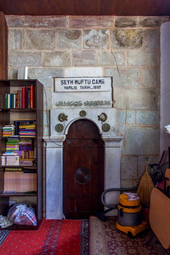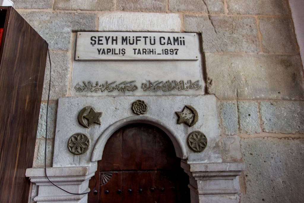Caminin kuzeyindeki harimin giriş kapısı üzerinde yer alan üç satırlık mermer kitabede “Şeyh Müfti cami şerifi” nin 1894-95 yılında “Naib Şefik Bey” in yardımlarıyla yapıldığı yazılıdır. Cami kuzey güney doğrultusunda dikdörtgen planlıdır. Güneyde harim, kuzeyde, sonraki bir dönemde inşa edilen son cemaat yeri, batı cephenin kuzey köşesinde minare yer alır. Harim kuzey-güney doğrultusunda dikdörtgen planlıdır. Ortada dört sütun üzerinde yükselen kubbe, yanlarda düz tavanla örtülüdür. Son cemaat yeri yapının beden duvarlarından alçaktır ve düz çatıyla örtülüdür. Ahşap desteklere oturan beş yuvarlak kemer açıklığı camekanlıdır. Orta bölüm kapı olarak değerlendirilmiştir. Doğu cephe güneyde harim, kuzeyde son cemaat yerlerinden ibarettir. Harim cephesindeki altlık pencereler sivri kemerli, demir parmaklıklı, üstlük pencereler yuvarlak kemerlidir. Batı cephenin güneyinde harim cephesi, kuzeyinde türbe ve minare yer alır. Harimin cepheleri moloz taş ve tuğlalarla düzensiz bir teknikte örülmüş, köşelerde kesme taş kullanılmıştır. Son cemaat yeri ve kubbe kasnağı ahşaptır.