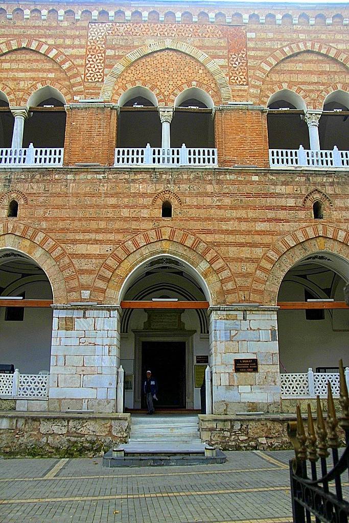 Merdivenlerden üst katın revakına çıkılır. Revak önden altı yığma ayak ve aralarında beş adet sütun ile ayrılmış sivri ikiz kemerle yaptırılmıştır. Revaktan birer dehlizle koridora gelinir. Koridora açılan on iki adet hücresi yer almaktadır. Hücreler tonozludur, yanlarda tonozla örtülü dershane olarak kullanılan dört oda daha vardır. Tek minaresi tuğladan örülmüştür. Çift zincir, tek zincir, kuş gagası, balık sırtı motifi altı sıra stalaktitle şerefeye geçilir. Takke külahlıdır. Üst kat eyvanının kemer alınlıklarında köşe tromplarında süsleme unsurları görülmektedir. Mermer sütunlar ve başlıklar Bizans yapılarından alınarak burada kullanılmıştır.