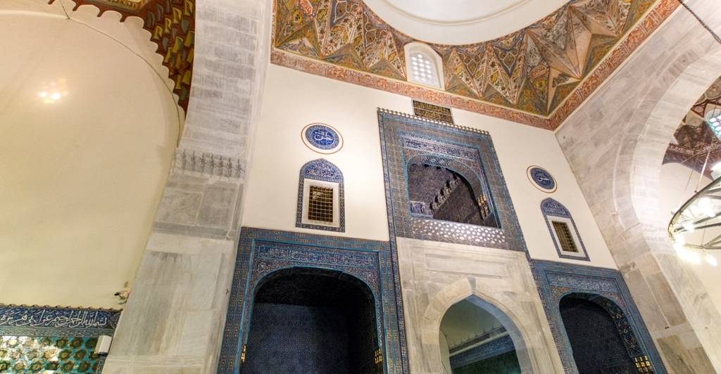 Cami, mimari özellikleri yanında çini süslemeleri ile de büyük bir öneme sahiptir. Özelikle iç mekânda eyvanlar, müezzin mahfilleri, hünkâr mahfili, tabhaneler, şahnişinler ve mihrap çini süslemenin yoğun olarak kullanıldığı bölümlerdir. Bunlar arasında bütünüyle çini ile kaplanmış mihrap zengin süslemeleriyle dikkat çeker.
