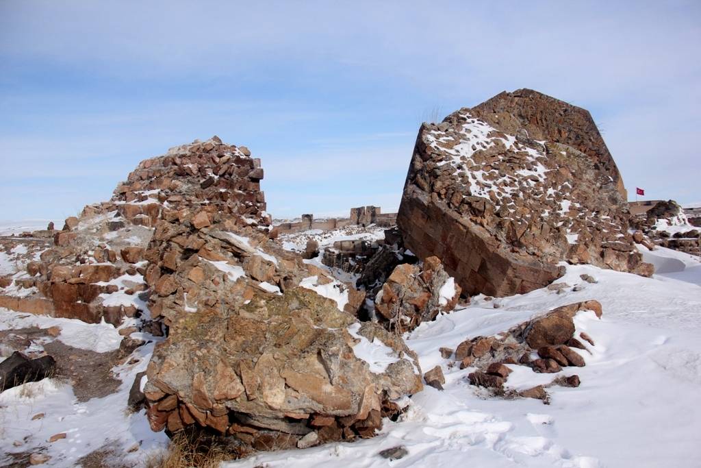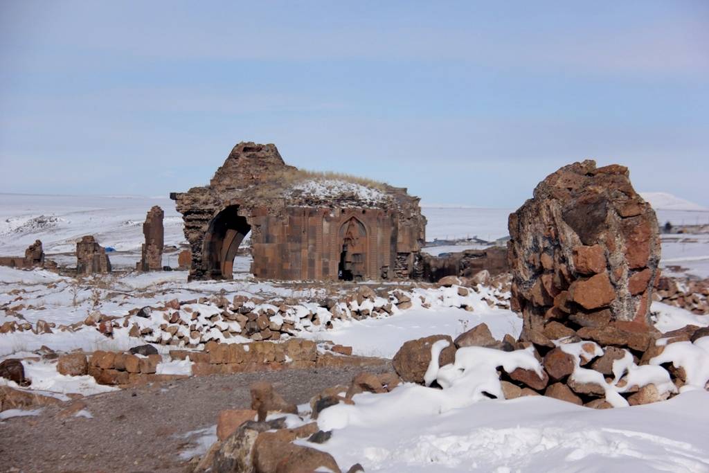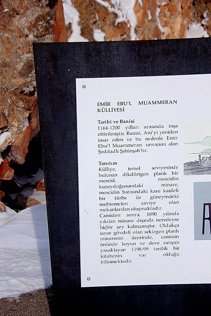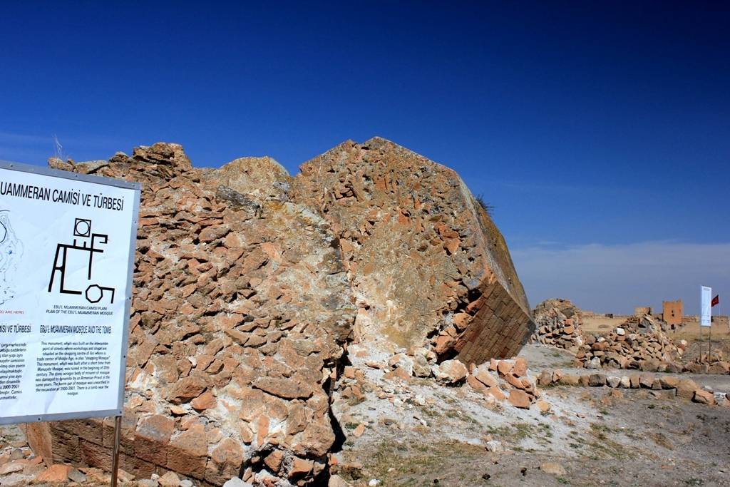 Selçuklu sultanı Alpaslan’ın 1064 tarihinde Anı Şehrini fethetmesinden sonra şehrin idaresini Şeddatlı beyliğine bırakmıştır. Şeddadi sülalesinde ilk Anı beyi olan Ebû’l Manuçehr’in oğlu Ebû’l Muammeran babasının ölümünde sonra Anı beyliğine geçince şehirde yaptırdığı imar faaliyetleri kapsamında kendi adını taşıyan Ebû’l Muammeran camiini de yaptırmıştır. Örenyerindeki ayakta kalmış tek cami olan Ebû’l Manuçehr camiinin planına benzer bir plana sahip olan Ebû’l Muammeran camiinin minaresi de Manuçehr camiinin sekizgen minaresi ile aynı mimari özelliklere sahiptir. 18.yüzyılda bölgeyi gezen seyyahların yaptığı Muammeran Camii gravüründe cami minaresinin Manuçehr camiinin minaresinde daha yüksek olduğu anlaşılmaktadır. Şehrin antik yolu üzerinde inşa edilen camiinin 19.yüzyılda kırılarak tahrip edilen M.S.1199 Hicri tarihli kitabesinde şehre gelen ticaret kervanlarının uyması gereken kurallar belirtilmiştir. Ebû’l Muammeran Camii 1917 yılında tamamen yıkılmış, günümüze cami minaresinin yıkık bir bölümü ulaşabilmiştir.