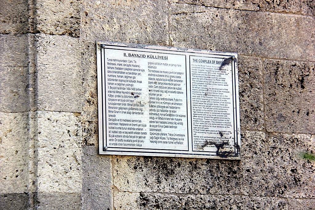Beyazıt Külliyesi geniş bir sahayı kaplamaktadır. Bir duvarla ayrılan dış avlunun sağında dârüşşifâ ile medrese, solunda ise kervansaray (?), mutfaklar ve aşhane-imaret yer almıştır. Bu dış avlunun Tunca tarafındaki ucunda ise cami bulunur. Avlu kapısının dışında duvara bitişik olarak dört cepheli ve üstü piramit biçiminde kâgir külâhlı bir çeşme vardır. Kitâbesine göre bu çeşme Sinan Ağa tarafından 1080 (1669-70) yılında yaptırılmıştır.