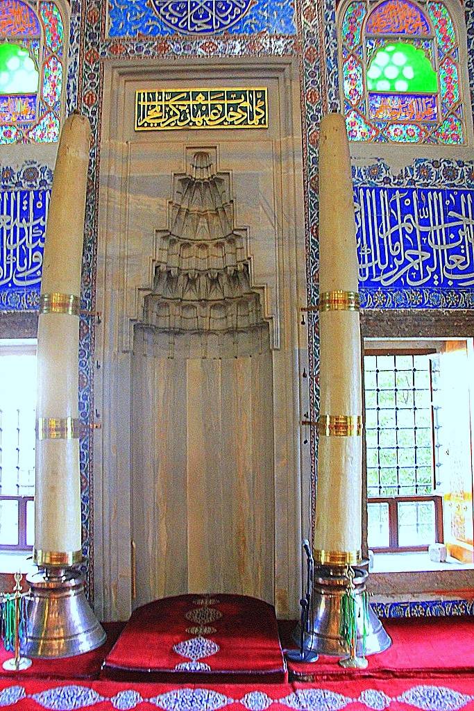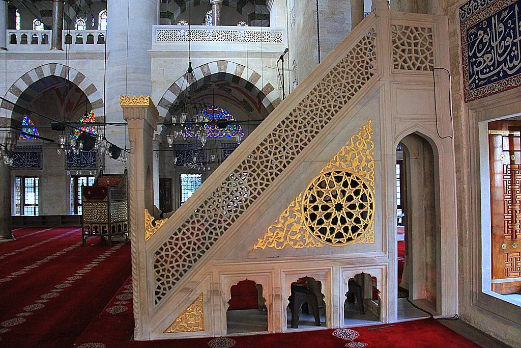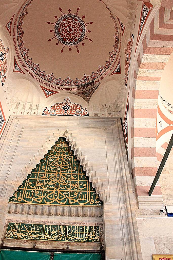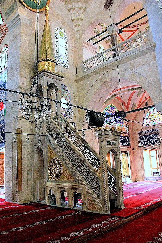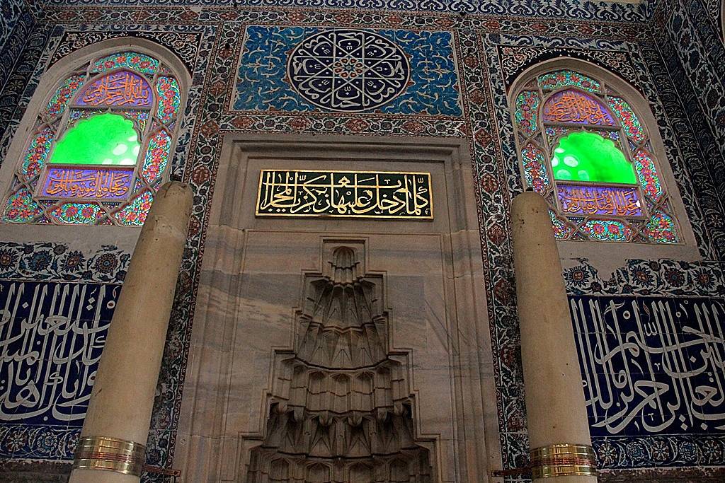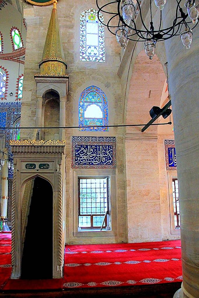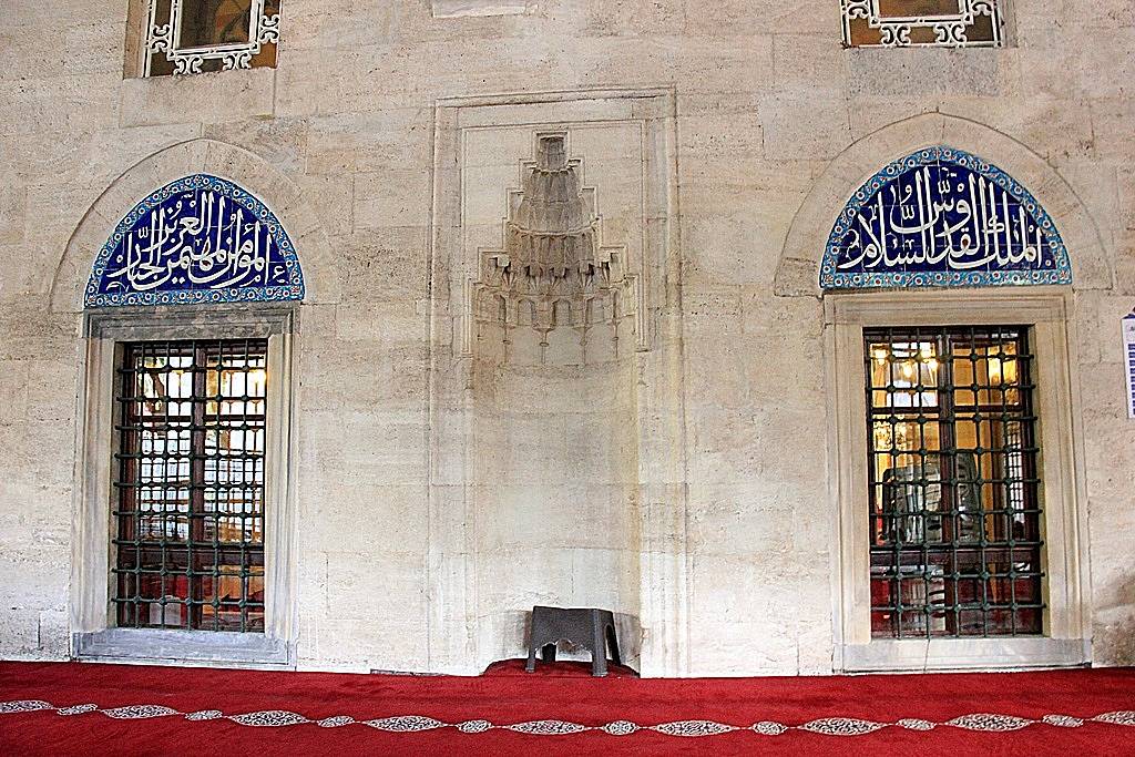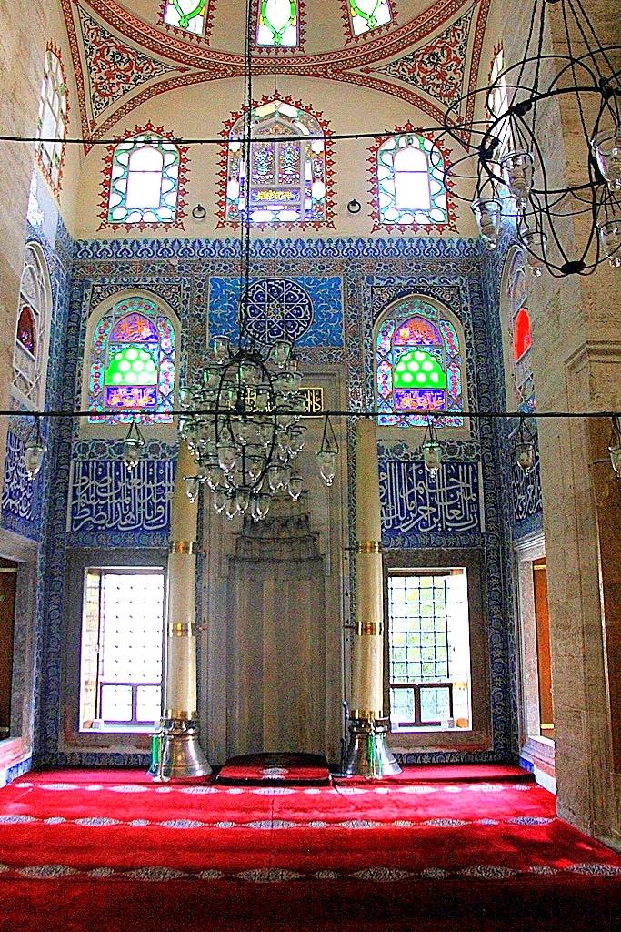 Camideki Osmanlı mimari zevkinin en bariz yansımalarından biri kuşkusuz Bursa stilindeki mihraptır. Dışa çıkıntılı, yarım kubbe ile örtülü, kaide kesimi ile iç yüzü mermer, etrafı ise bütün yüzeyi tamamen çiçekli nefis İznik çinileriyle kaplıdır. Kıble duvarının ana mekâna bakan bölümünde üstleri çinilerle süslü olan tüm kemerli pencerelerde zarif vitraylar kullanılır. Bu yüzden de pencerelerden süzülen ışığın ahenkli dağılımının meydana getirdiği sade görkem, burayı caminin odağı haline getirir. Mihrabın sağ tarafında tamamen işlemeli mermerden yapılmış ve oldukça yüksek tutulmuş minber üstündeki sivri ve zarif külah caminin iç manzarasındaki ahenge ayrı bir ihtişam katar.
