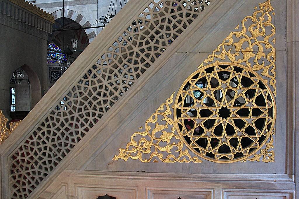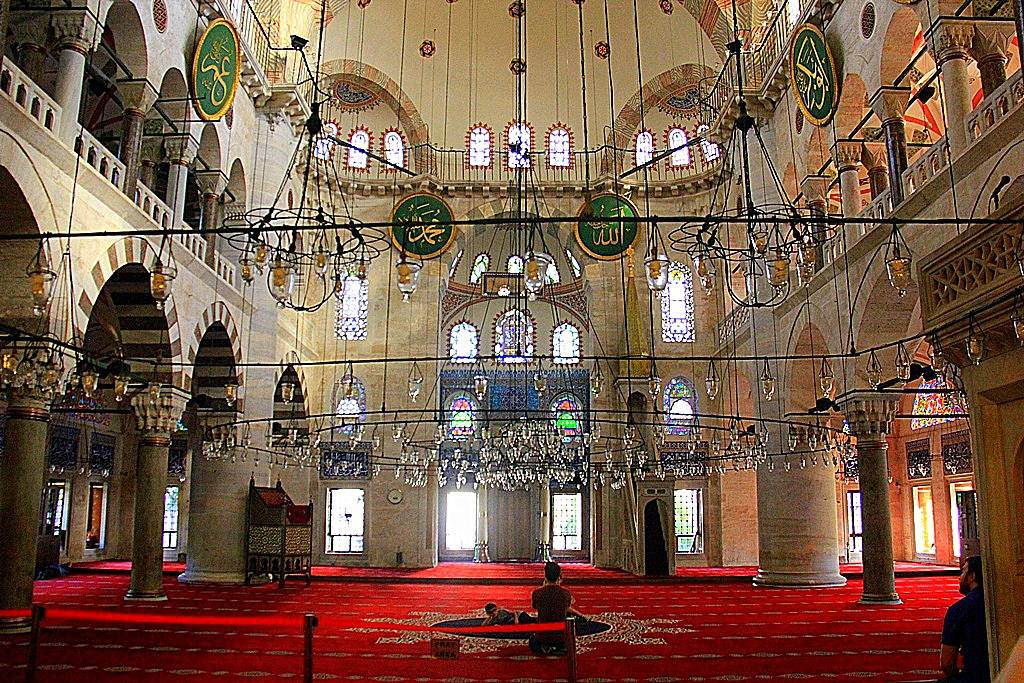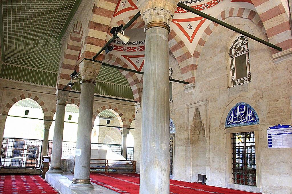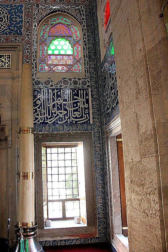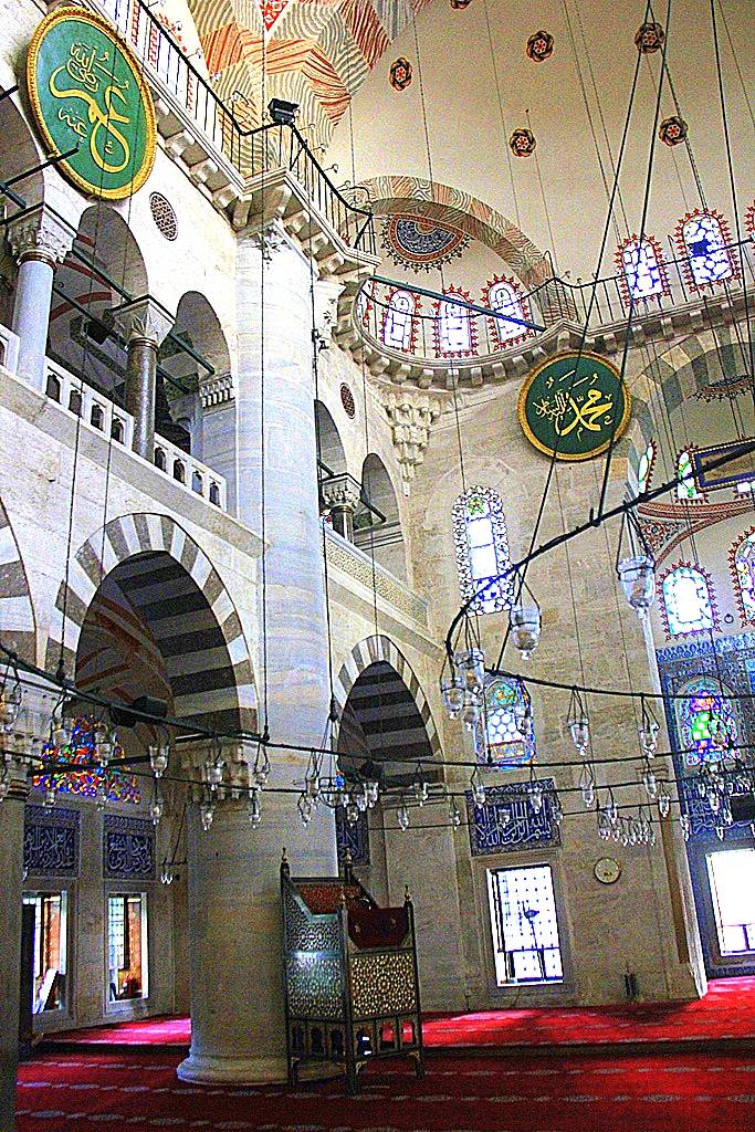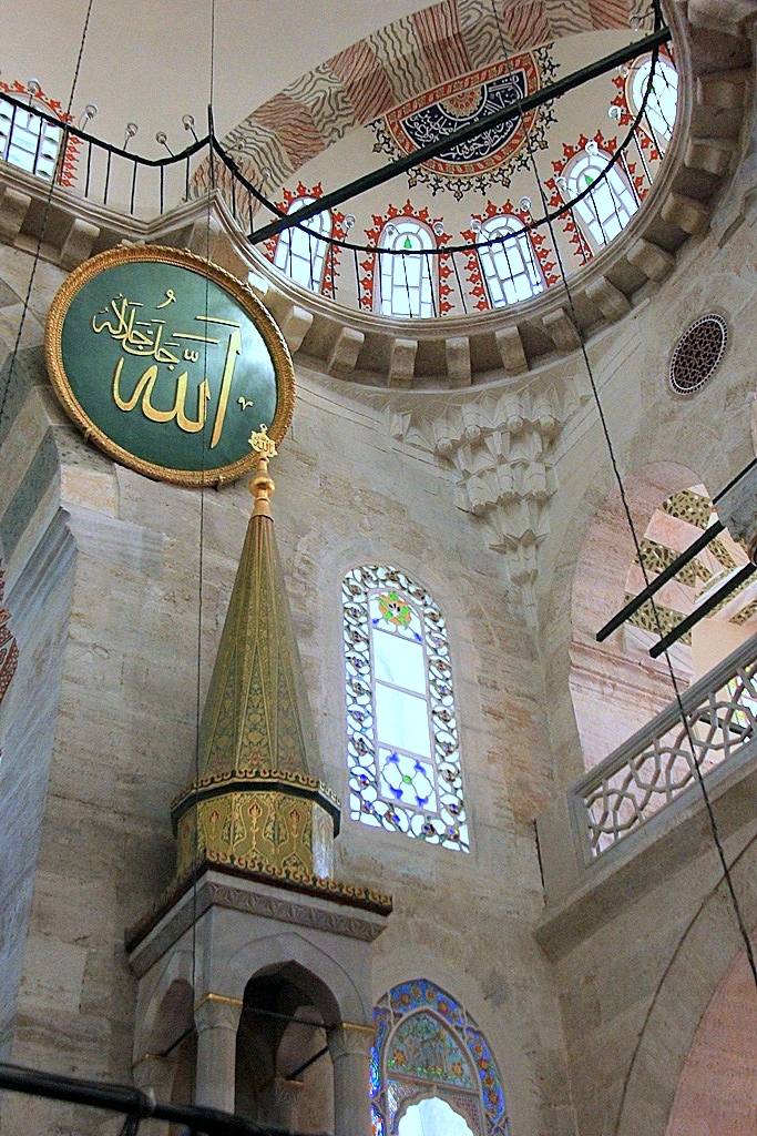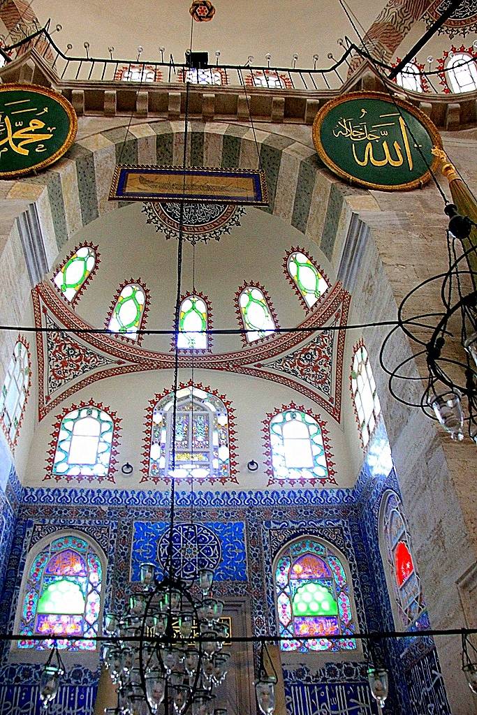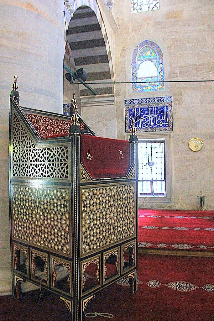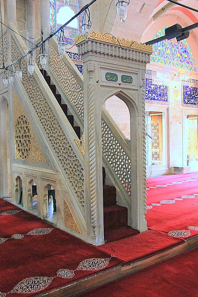 Camideki Osmanlı mimari zevkinin en bariz yansımalarından biri kuşkusuz Bursa stilindeki mihraptır. Dışa çıkıntılı, yarım kubbe ile örtülü, kaide kesimi ile iç yüzü mermer, etrafı ise bütün yüzeyi tamamen çiçekli nefis İznik çinileriyle kaplıdır. Kıble duvarının ana mekâna bakan bölümünde üstleri çinilerle süslü olan tüm kemerli pencerelerde zarif vitraylar kullanılır. Bu yüzden de pencerelerden süzülen ışığın ahenkli dağılımının meydana getirdiği sade görkem, burayı caminin odağı haline getirir. Mihrabın sağ tarafında tamamen işlemeli mermerden yapılmış ve oldukça yüksek tutulmuş minber üstündeki sivri ve zarif külah caminin iç manzarasındaki ahenge ayrı bir ihtişam katar.