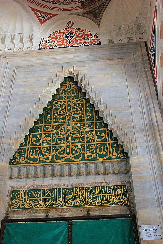 Yıllar boyu incelediği Ayasofya’yı andıracağını söylediği, içine Türk mimarisinden unsurlar da katarak vücuda getirmeyi plânladığı Kılıç Ali Paşa Camii için büyük usta mimar Sinan şöyle der: “Deryalar kudursa ve azgın dalgalar kubbenin tepesinden aşsa, yine bu mabet kıyamete dek Allah’ın izniyle ayakta kalacak!” Yıllardır vapur ve bina bacalarından çıkan kara dumanlarla taşının rengi siyaha çalsa da, Kılıç Ali Paşa Camii pembe renkli Ayasofya’nın adeta küçük bir örneğidir. Kılıç Ali Paşa Camii ve Külliyesi, geniş bir avlu ile çevrili. Avluya simetrik duvarlarındaki dört ayrı kapı ile girilebiliyor. Avlu ortasında zarif bir kubbe ile örtülü şadırvanı ise son derece göz alıcı. Şadırvanlı avludan demir parmaklıklı iç avluya geçildiğinde biri beş kubbeli ve altı sütunlu, diğeri ise ahşap, ağaç oyma ve işlemeciliğinin en zarif örnekleri ile süslenmiş bir saçakla örtülü iki tane son cemaat mahalline ulaşılır.