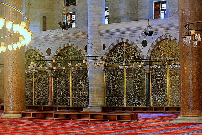 Ve mihrabın sağında ve solunda burma, zıh zıh yapma sütunlar ve yine orada bir adam boyu halis bakır ve halis altunla cilalanmış şamdanların üzerinde yirmişer kantar kafuri balmumları. camiin sol köşesinde sütun üzre bir yüksek makam, Hünkar Mahfili vardır, ...dört sütun payelerin köşelerinde dört tane aşırhan maksurecikleri var... camiin iki tarafında yan suffaları var...yine bu suffalara eş ince sütunların üzerinde deryaya nazır ve sağ tarafı çarşuya bakan katlar. Cemaat çok olduğu zaman bu suffalarda ibadet ederler...mübarek gecelerde kandiller yakarlar hepsi yirmi iki bin kandil ve asılmış avizeler. Bu camiin içinde geride Kıble Kapusu tarafındaki iki payelerde bir çeşme vardır. ve bazı taklar altında Üst Hazine Maksureleri.
